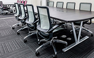 会議中に様々な意見が飛び交うよう、動きをつけて施工しました。シンプルなタイルカーペットも貼り方次第で印象が大きく変わります。